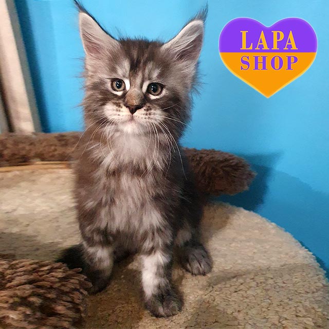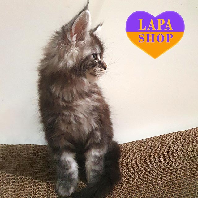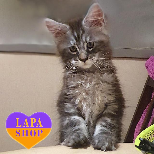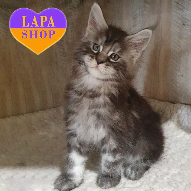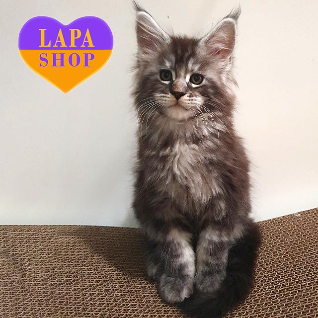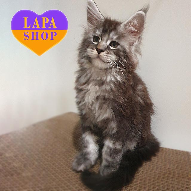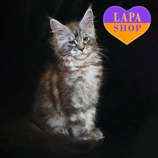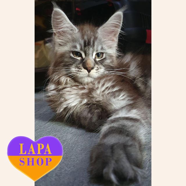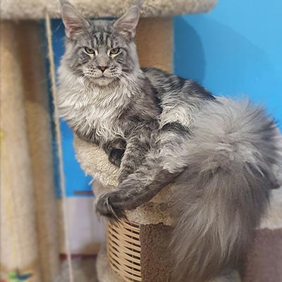 Zevs is a luxurious Maine Coon with a distinctive black-silver-marble coat. His fluffy coat, large paws and penetrating gaze emphasize his natural grace and strength.