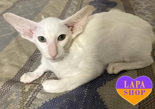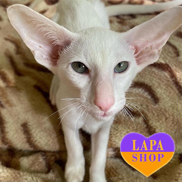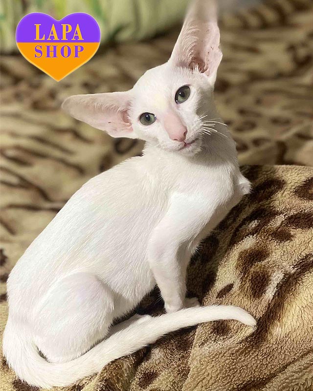 He has a perfectly white color and green eyes that conquer at first sight. He has beautiful proportions: a slender body, long legs and large ears that create a truly aristocratic appearance.