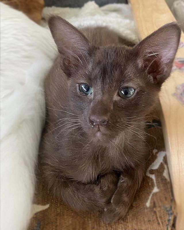 Moris is a Oriental Longhair (Javanese) with a luxurious chocolate color. He has a silky, elongated coat and a graceful, elegant body. His large almond-shaped eyes captivate at first sight.