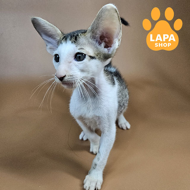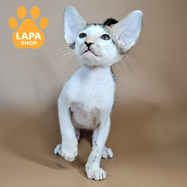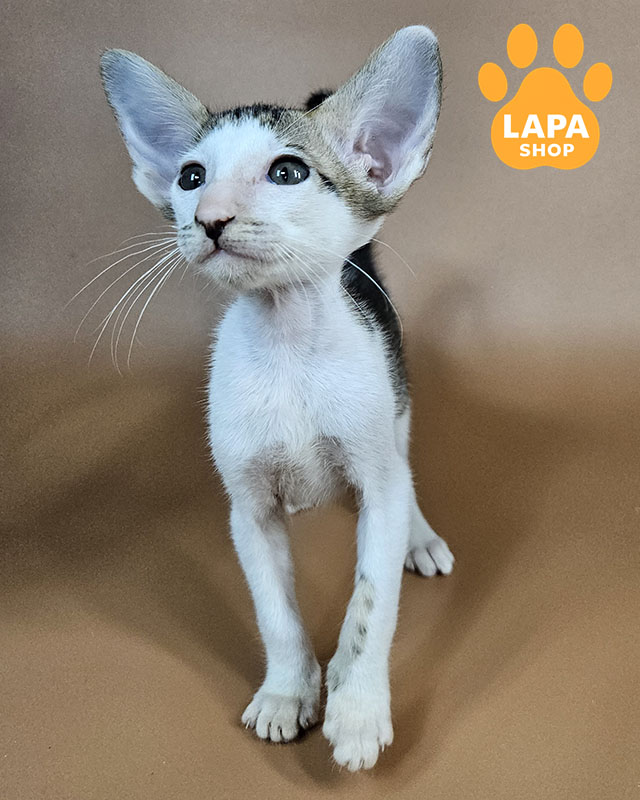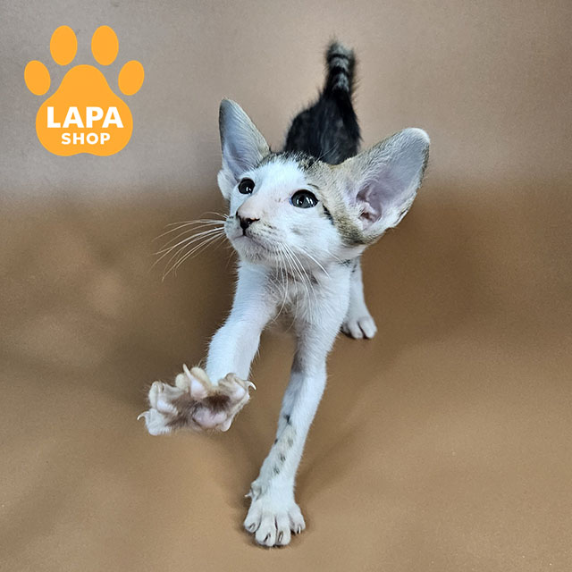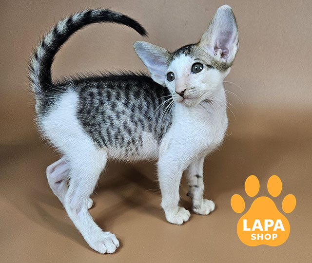 Ophelia is an oriental cat with a spectacular black spotted tabby color with white markings. The contrasting pattern on the fur coat gives her image special expressiveness and dynamics, emphasizing the slender lines of the body and elegant posture.