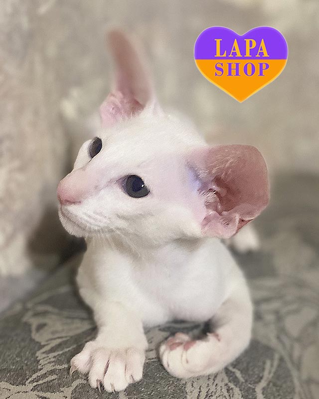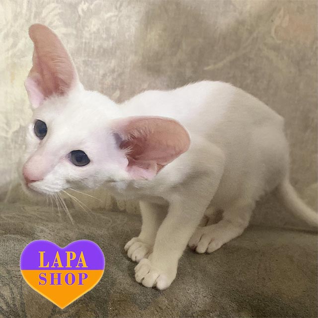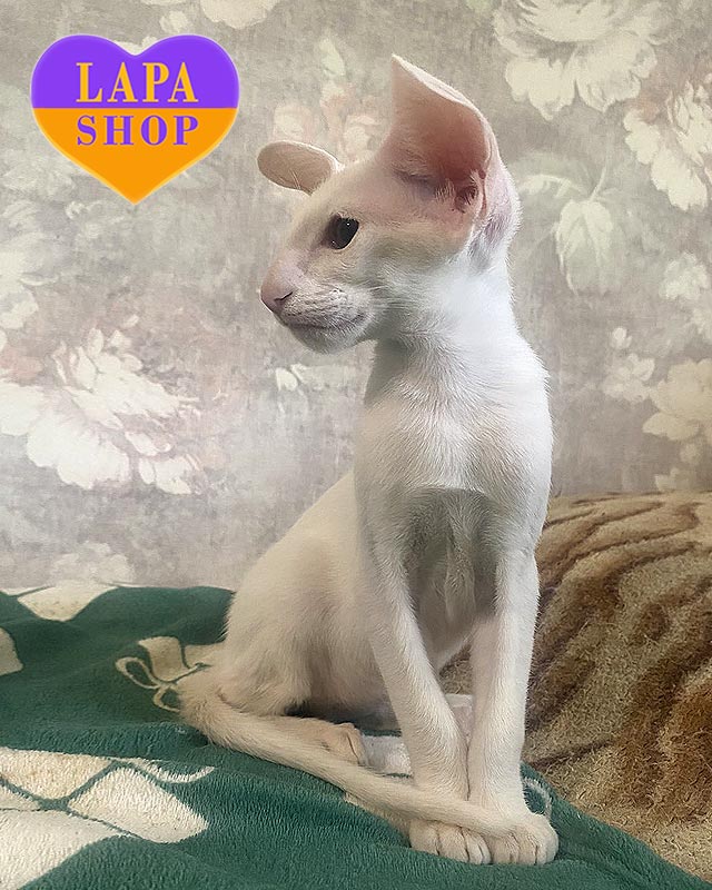 The incredible Winter is a charming boy of the Oriental breed, who has a perfectly white coat and charming green eyes, reminiscent of spring leaves. His graceful body, long paws and large ears give him elegance and sophistication.