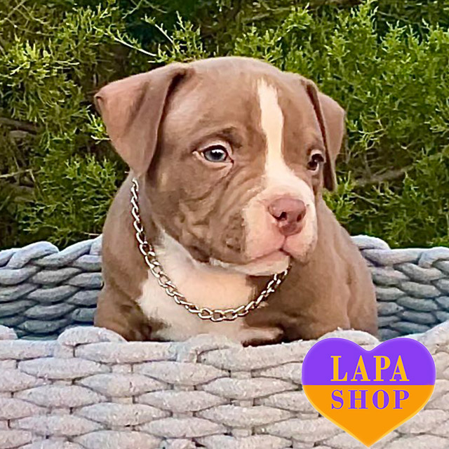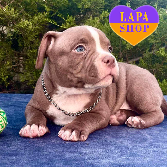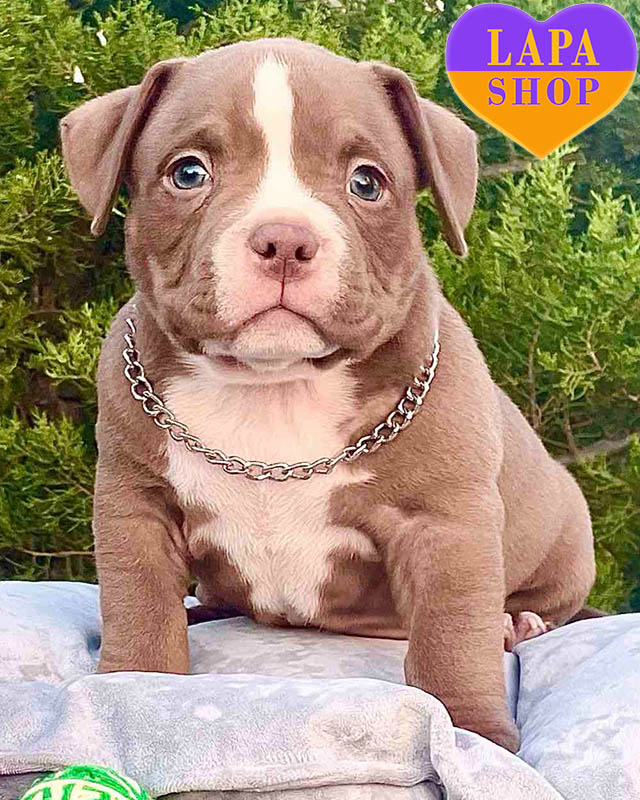 This adorable American Bully boy in the micro pocket type has a rare chocolate color, which gives him a special charm. His compact, strong build is combined with a cute and expressive face. From the very first days, he has been winning hearts with his charisma and confidence.