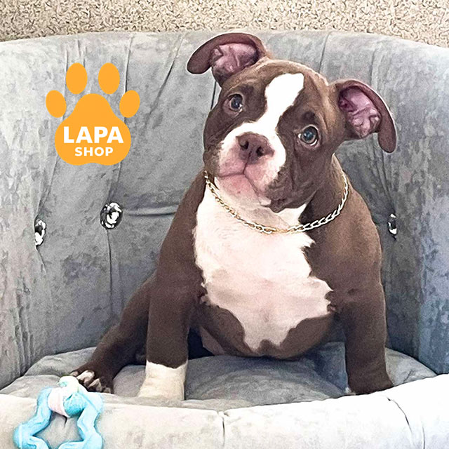 Adorable chocolate-colored American Bully girl. She has a micro-pocket type – in adulthood she will grow to 22–25 cm at the withers. Her petiteness and expressive appearance create a spectacular appearance that will definitely not go unnoticed.