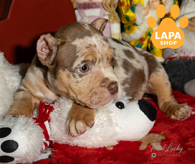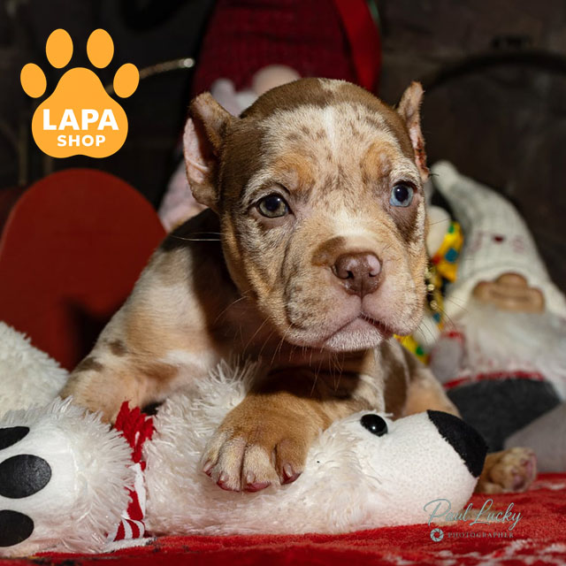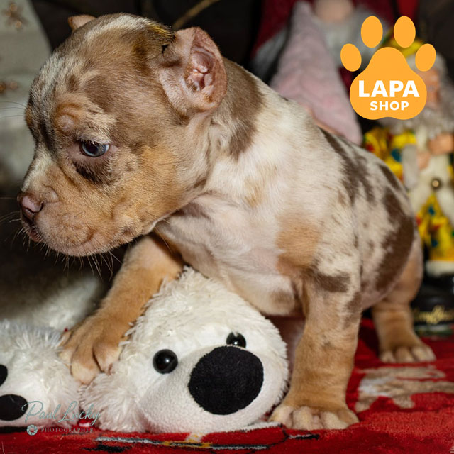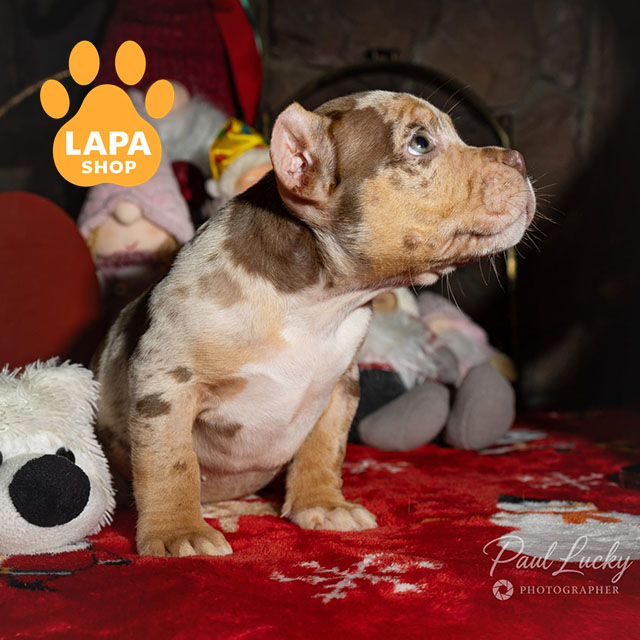 Thor is a bright American Bully (Pocket) boy in a luxurious chocolate merle with tan markings. His appearance is emphasized by different eyes, which add to his spectacularity and unique charm. Compact and proportionate, it attracts attention at first glance.