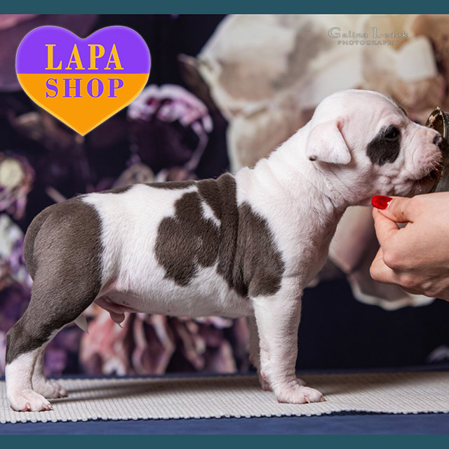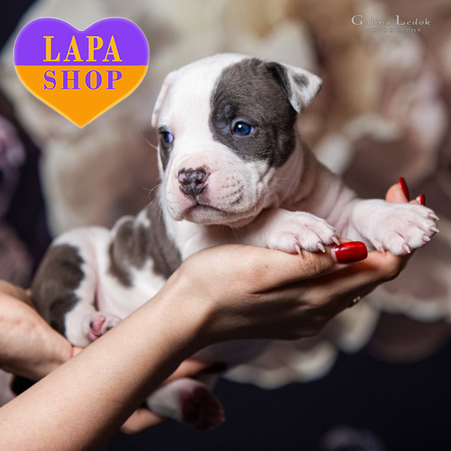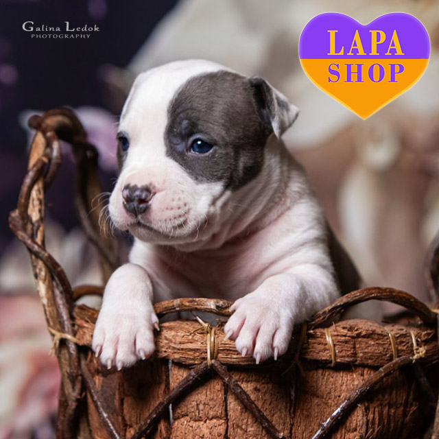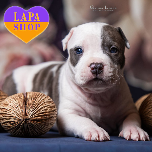 This magnificent representative of the American Staffordshire Terrier breed has a striking blue and white color. His strong build and confident appearance emphasize the character of this breed. This is a real handsome man who will be the perfect friend for your family.