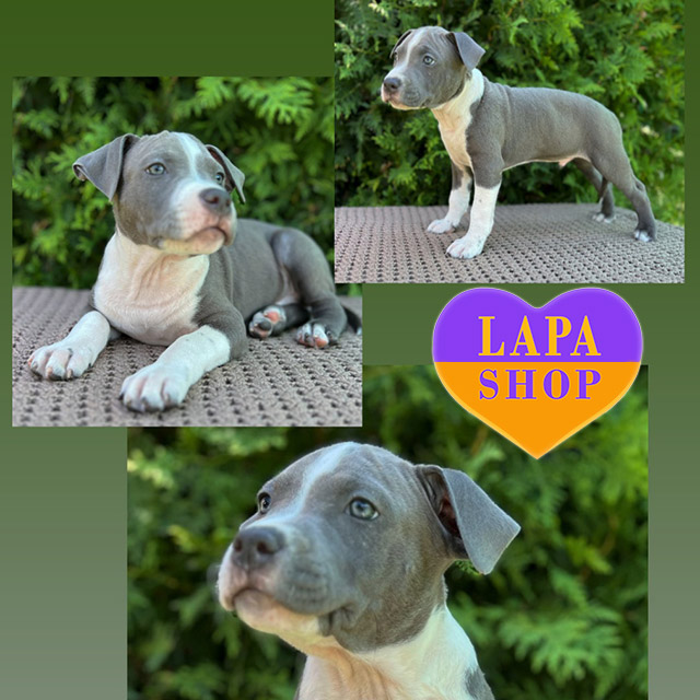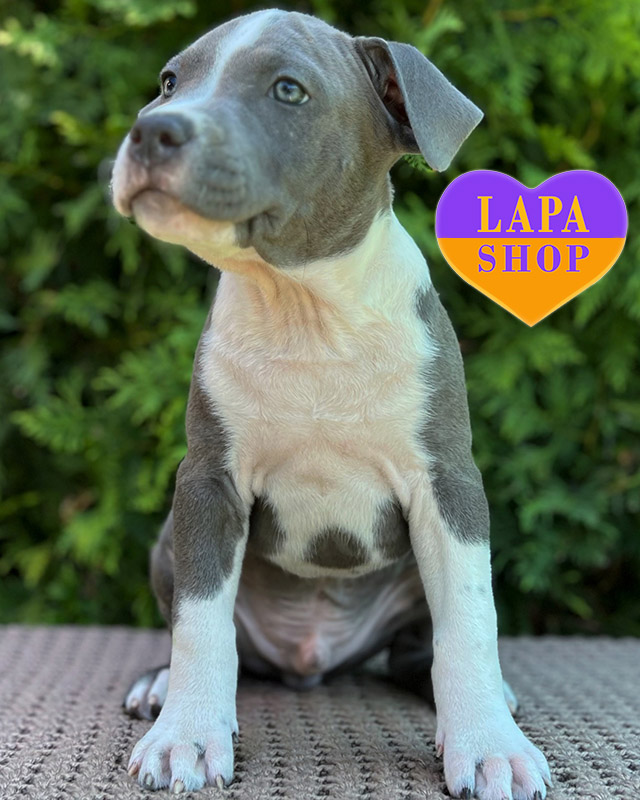 This handsome boy is an American Staffordshire Terrier with an exquisite blue color combined with white markings. His appearance is characterized by a harmony of strength and elegance, which makes him special among puppies.