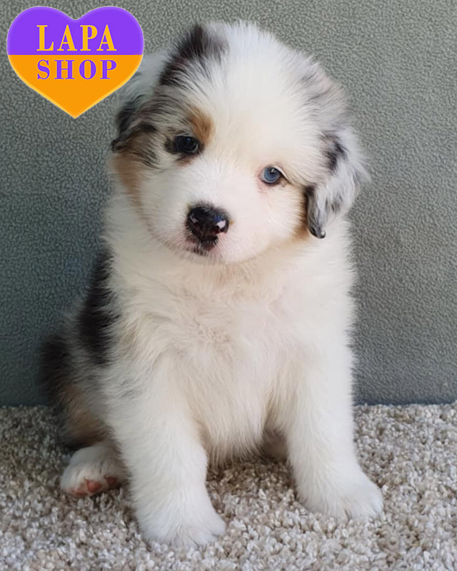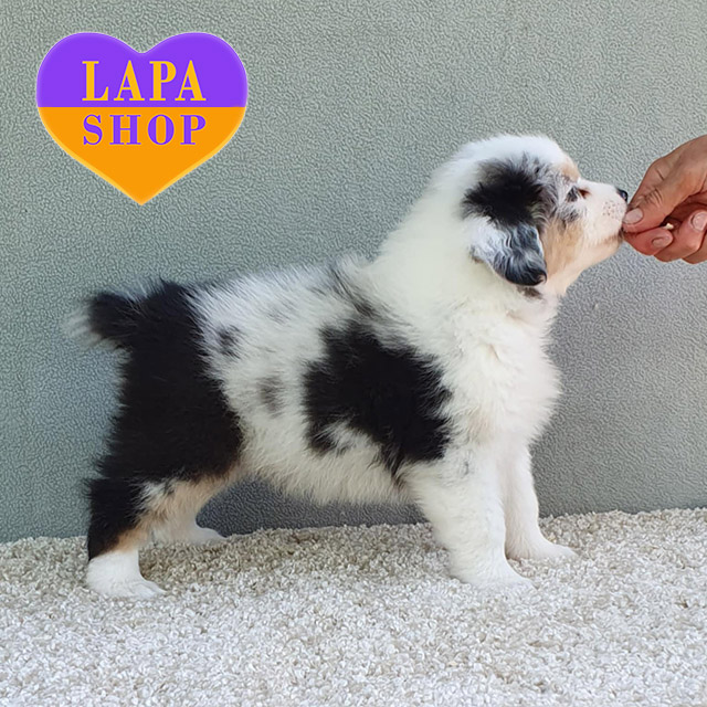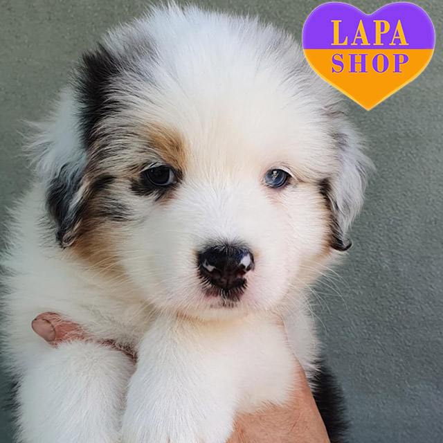 This adorable Australian Shepherd (Aussie) boy has a rare and distinctive blue marble color that immediately attracts attention. His fur shimmers in different shades of gray and black, forming a unique pattern.