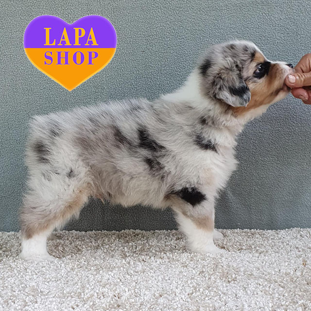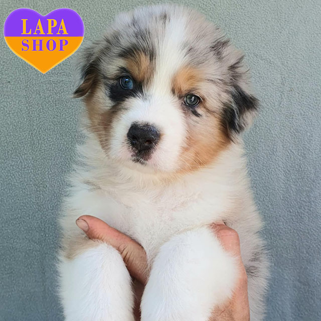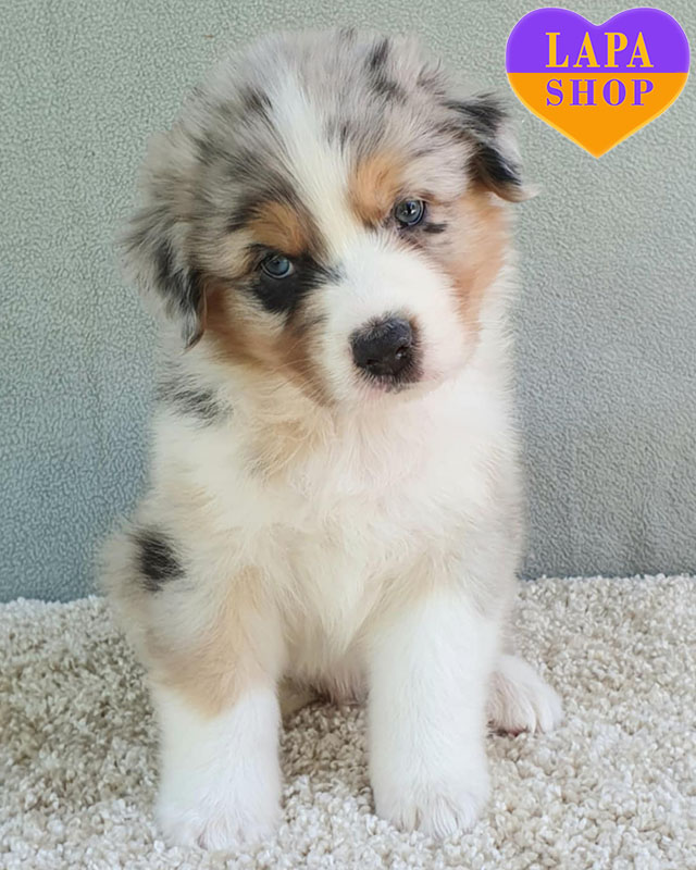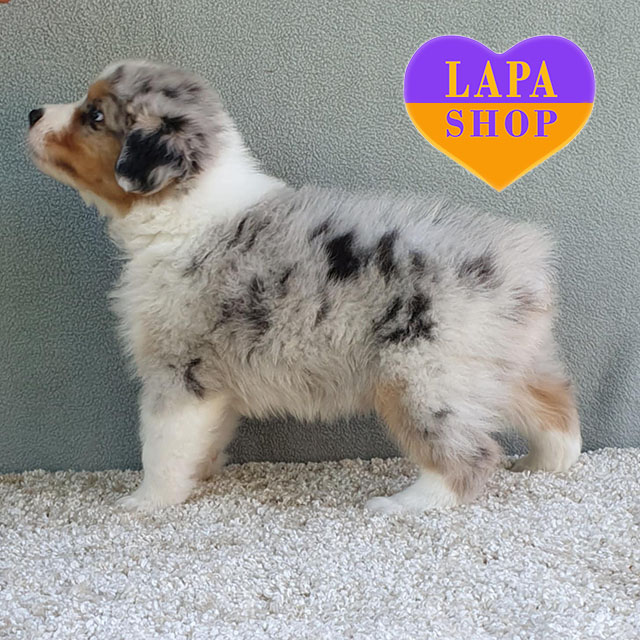 This adorable Australian Shepherd (Aussie) boy has a rare and distinctive blue marble color that immediately attracts attention. His fur shimmers in different shades of gray and black, forming a unique pattern.