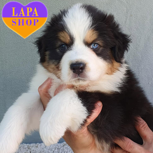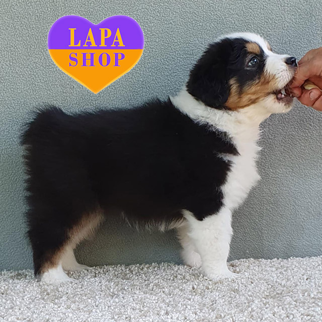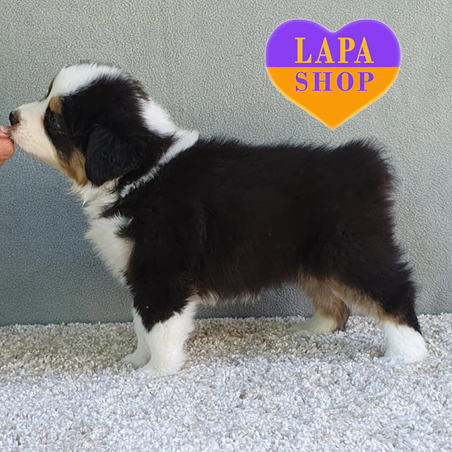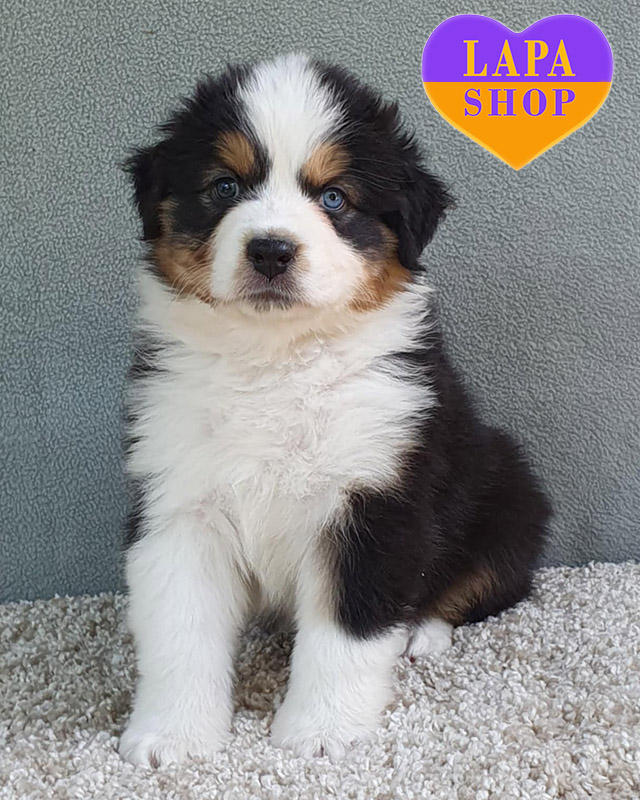This cute girl Australian Shepherd (Aussie) in the classic black tricolor looks extremely impressive. Her glossy coat is decorated with white and red splashes that harmoniously emphasize her expressive face. She has an attractive appearance and a friendly disposition, which makes her a real treasure for the family.