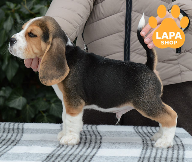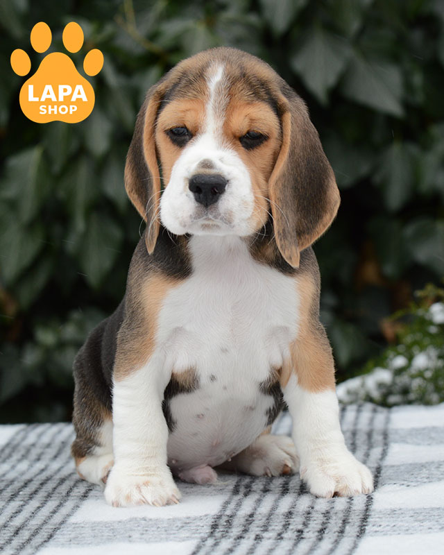 A charming beagle boy with a distinctive tricolor color. His proportionate physique, neat muzzle, and bright eyes make him particularly attractive.