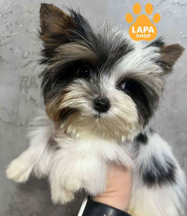 The boy of the Beaver Yorkshire Terrier breed has a gentle, neat appearance and harmonious proportions. His compact physique and neat format emphasize the breed type and elegance. The baby looks very attractive and well-groomed, with an expressive appearance.