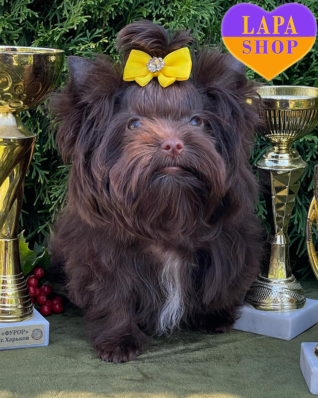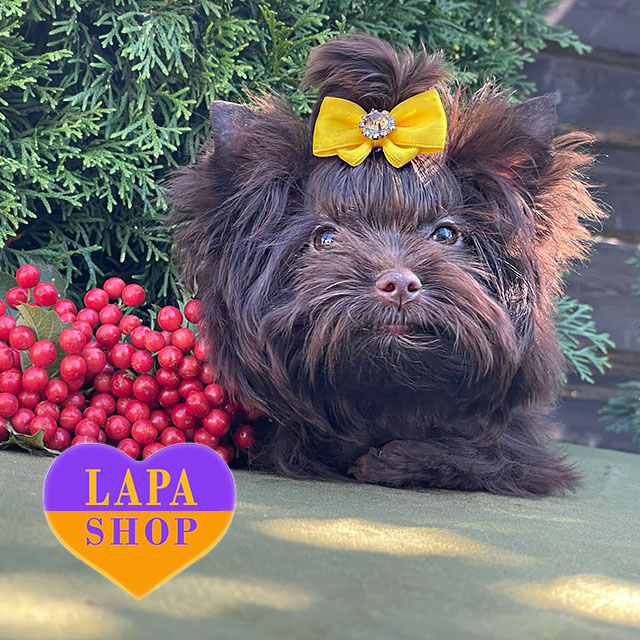 A miniature girl of the Beaver Yorkshire Terrier breed, chocolate in color, with an attractive and gentle appearance. Her harmonious color and pretty face make her especially charming.