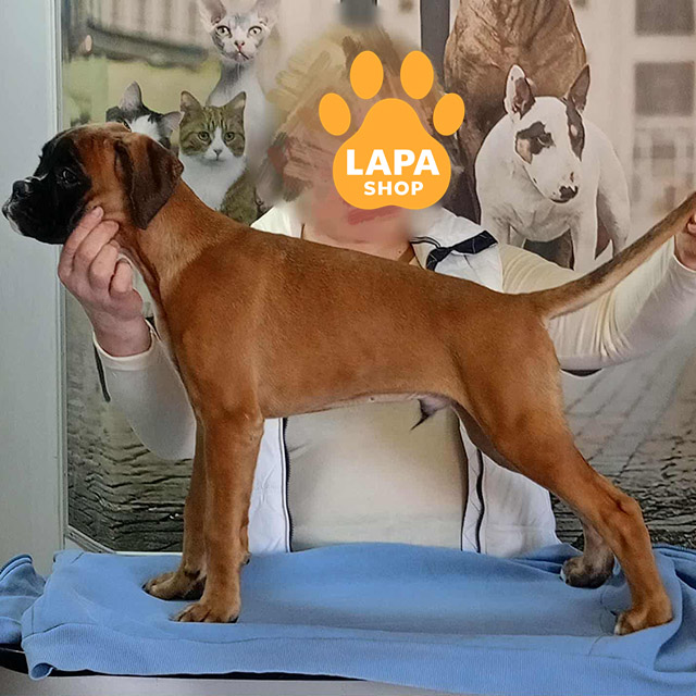 A cute boy of the German boxer breed with a rich red color. His harmonious physique and expressive face emphasize his pedigree and make his appearance especially attractive. The uniform shade of wool adds charm and elegance to it.