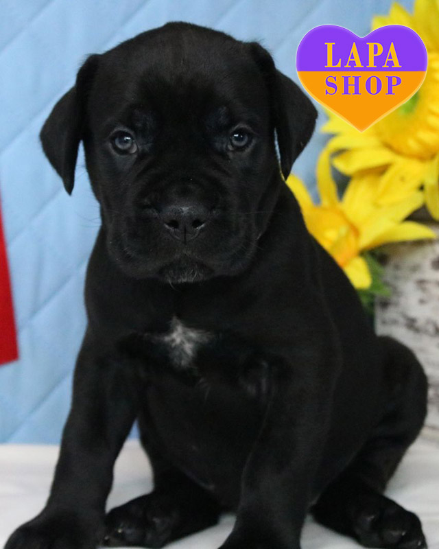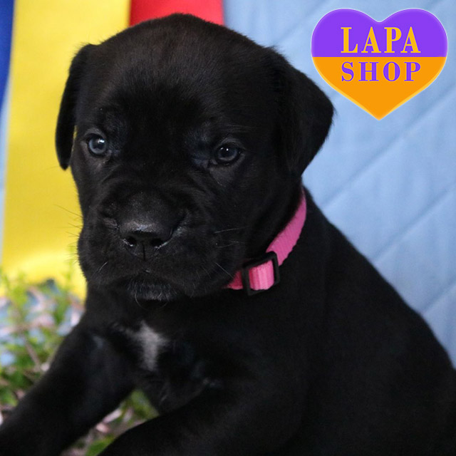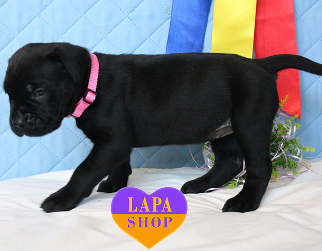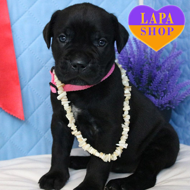This elegant girl is a Cane Corso with a deep black color that emphasizes her grace and strength. She has a noble appearance, a strong build, and a balanced temperament, making her ideal for both breeding and an active family life. Her gaze is already striking in its depth and intelligence.