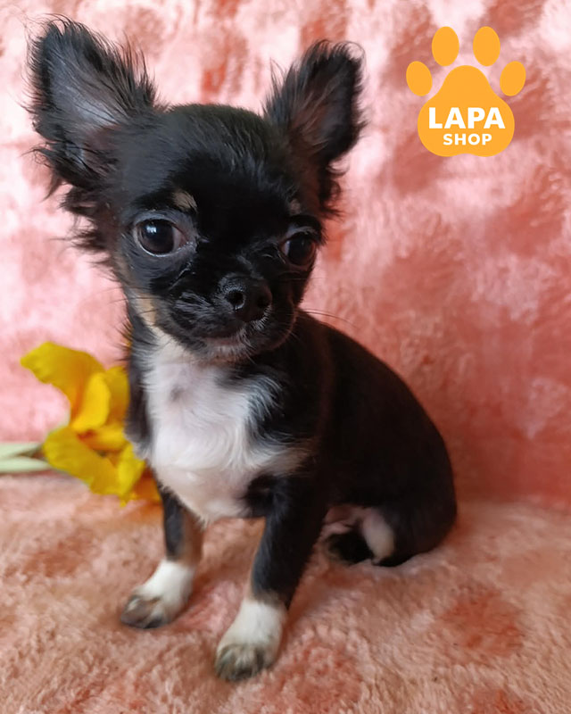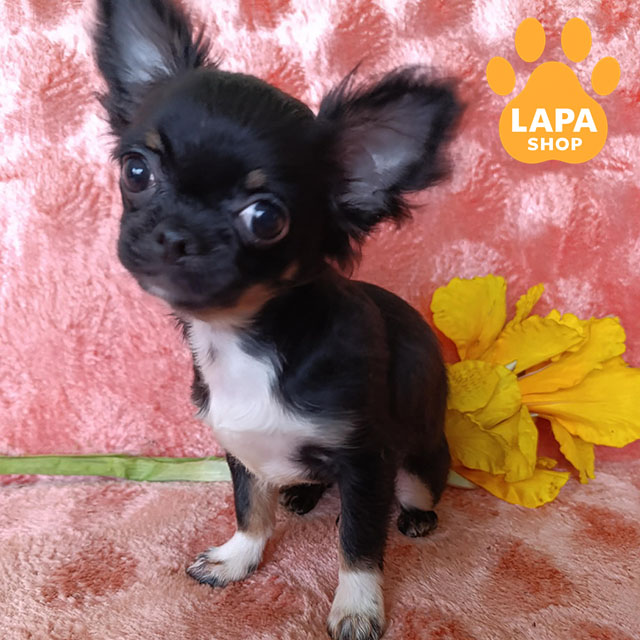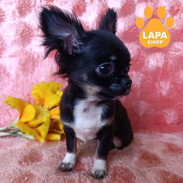 Arabesque is an adorable long-haired Chihuahua boy with a distinctive black tricolor coat. Its miniature size and harmonious appearance make it a real decoration of the home.