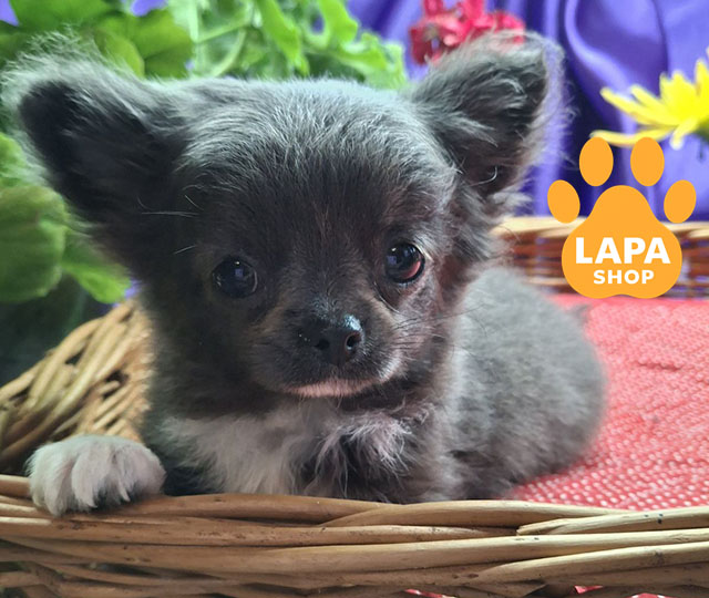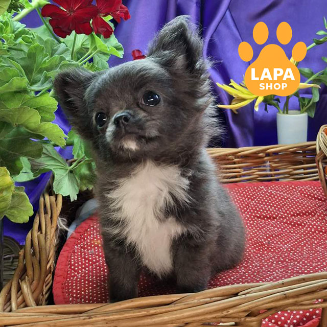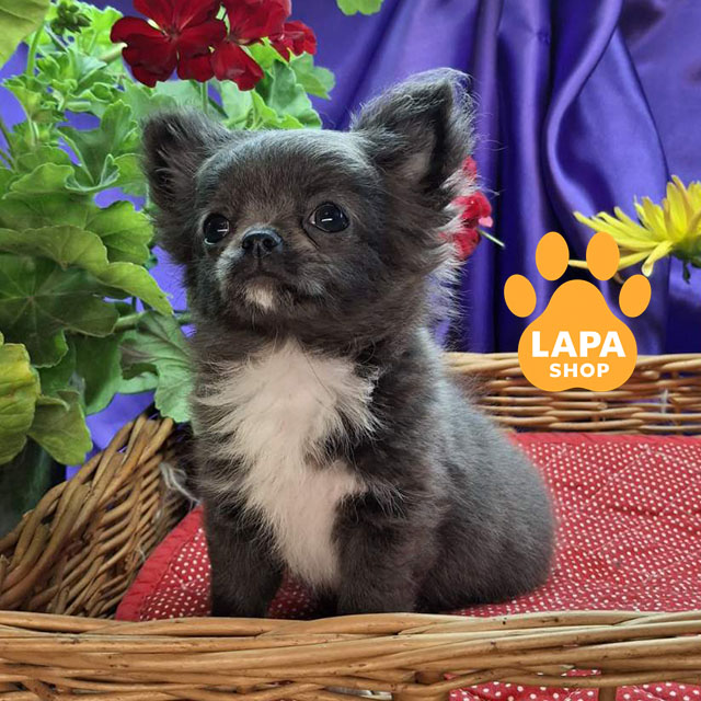 Romeo is an adorable long-haired Chihuahua boy with a rare blue color. His luxurious coat and harmonious appearance make him a true handsome man.