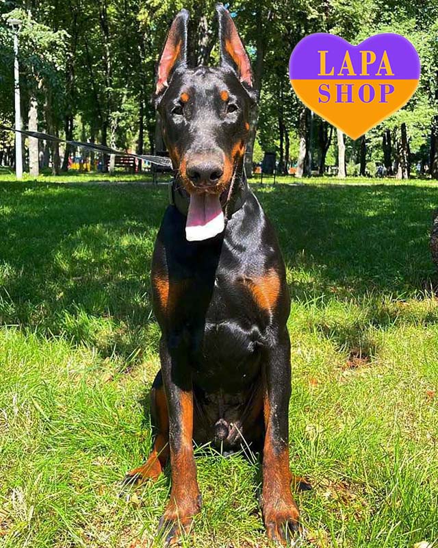 Leo-Kan is an elegant and strong black Doberman boy. He inherited a noble type and confident temperament from his titled parents. He is distinguished by his expressive black and tan color and already shows excellent prospects for both his show career and future sports.