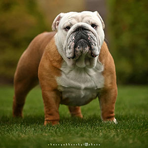 This adorable boy is an English Bulldog with a distinctive red and white color. His strong physique, wrinkles, and gentle gaze give him a special charm. The baby looks harmonious and truly pedigree, which makes him a real treasure among bulldogs.