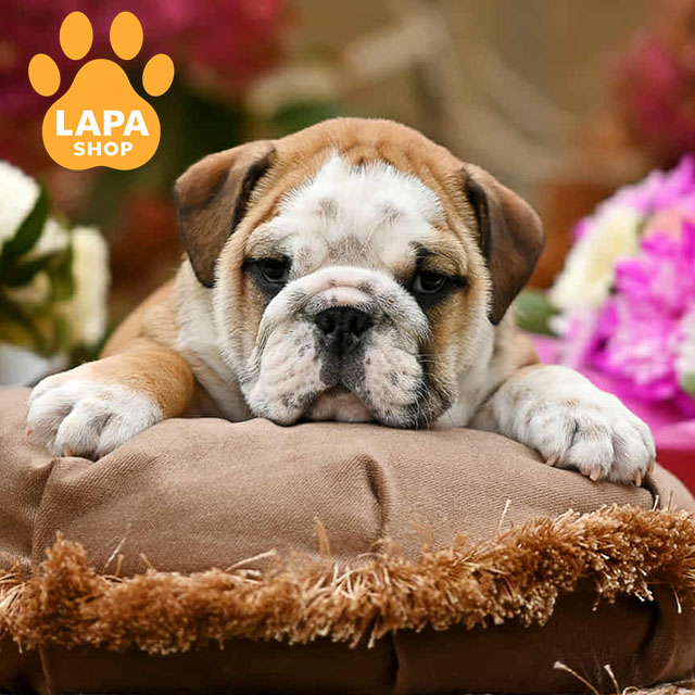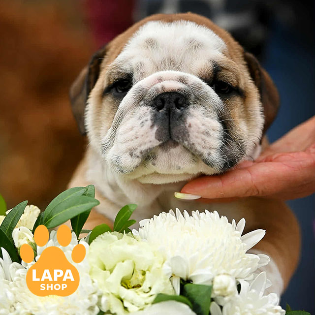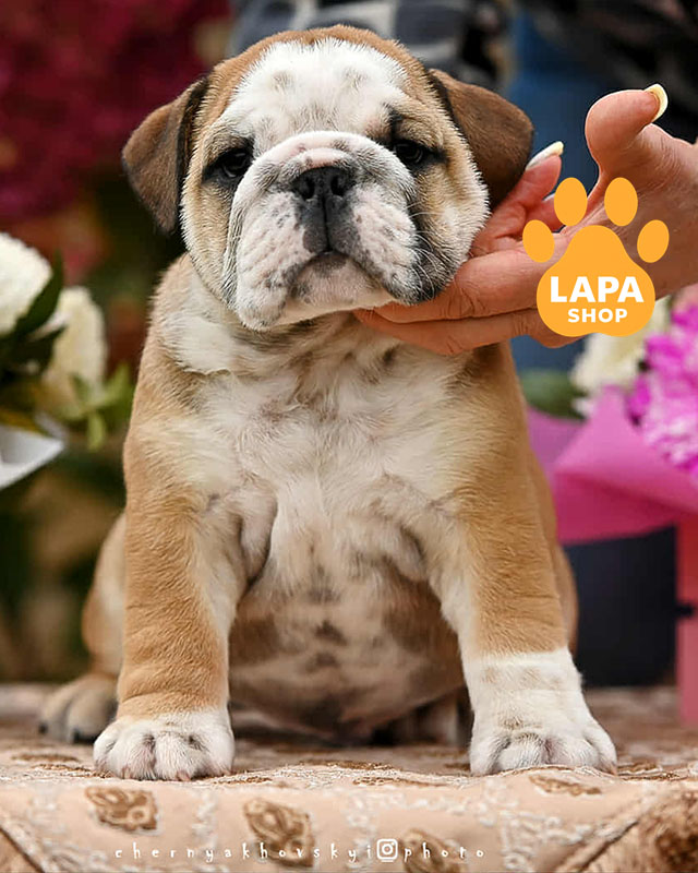 This adorable boy is an English Bulldog with a distinctive red and white color. His strong physique, wrinkles, and gentle gaze give him a special charm. The baby looks harmonious and truly pedigree, which makes him a real treasure among bulldogs.