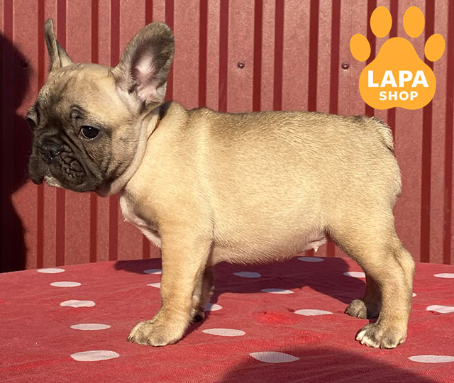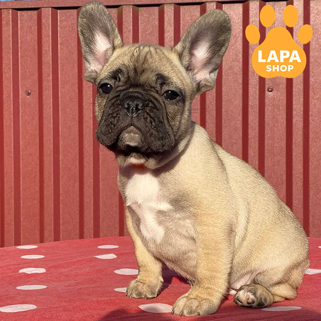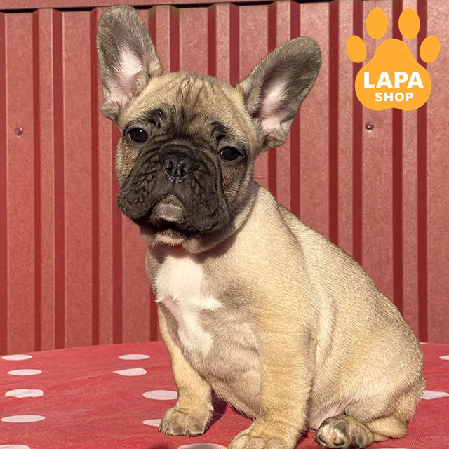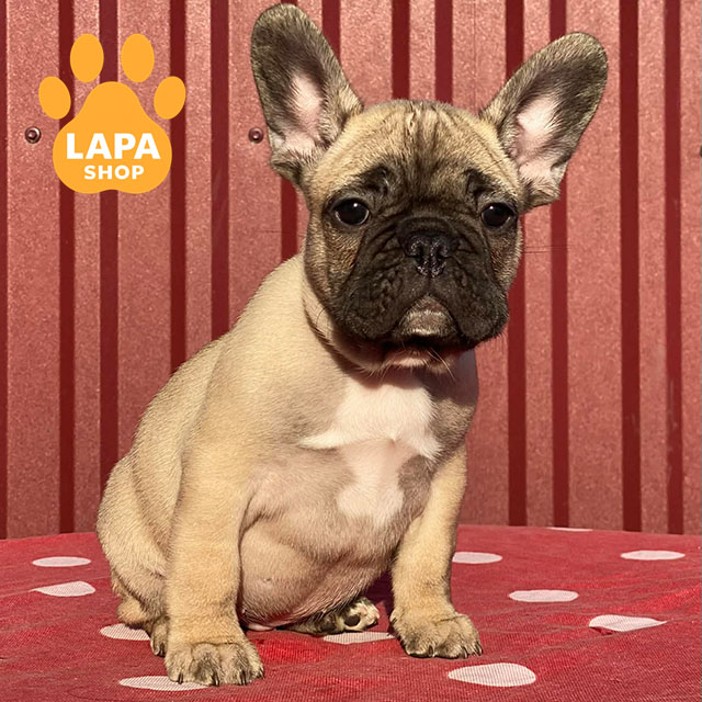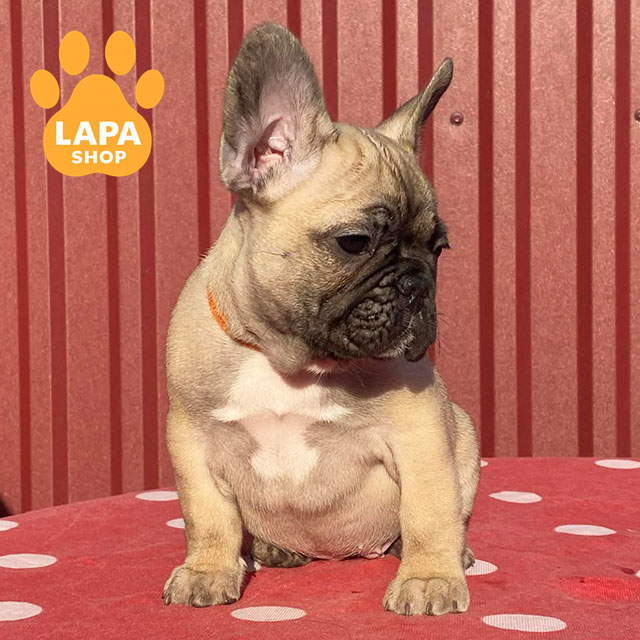 This adorable girl is a fawn French Bulldog. She has harmonious body proportions, a beautiful face, and a cute appearance that attracts attention.