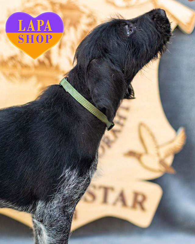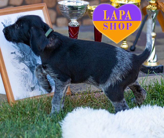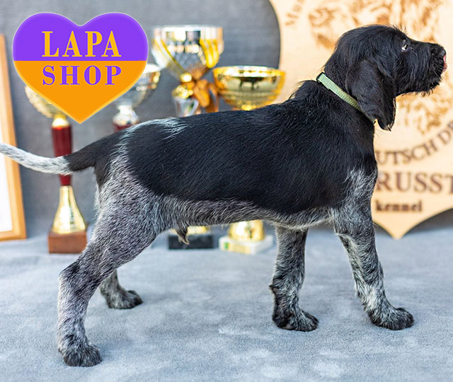 The Drathaar boy has a distinctive black color with gray hair, which looks very impressive and noble. His strong build and breed characteristics give him a confident and harmonious appearance. Such a boy is already striking in his appearance and promises to grow into a real handsome man.