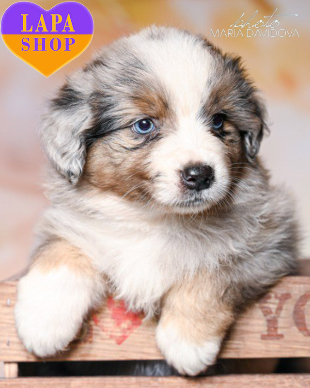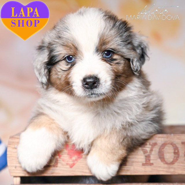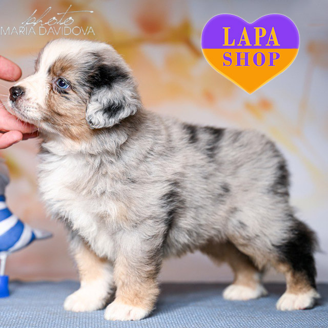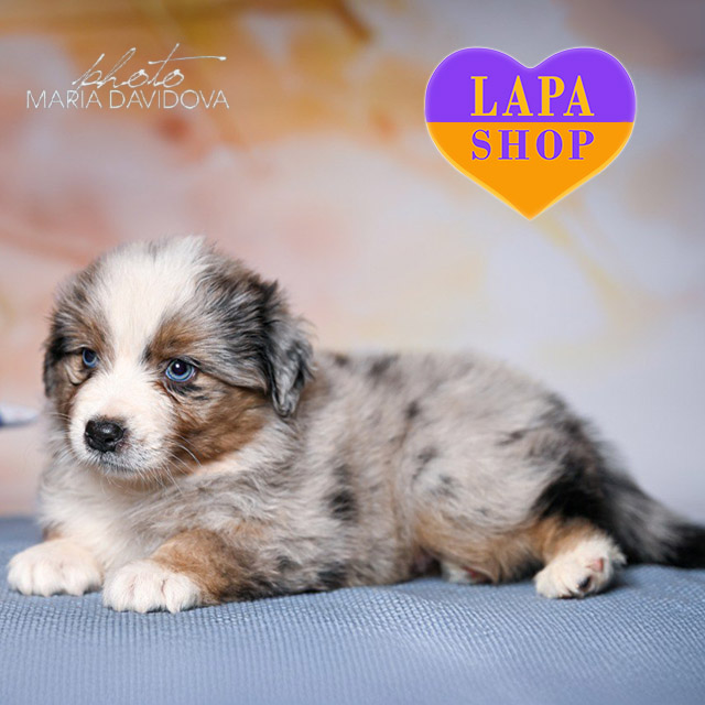 This miniature dog breed, the Miniature American Shepherd, has a charming blue marble color and expressive blue eyes, which make it extremely attractive. He comes from titled parents, both of whom are champions of numerous countries and have clean genetic tests, making him a promising breeding prospect. His unusual coloring and neat structure emphasize breed qualities and aesthetics.