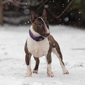 Germione Granger is a charming girl of the miniature bull terrier breed in a brindle and white color. Her compact build and expressive appearance give her a special charm. The bright coat pattern makes this beauty even more attractive.