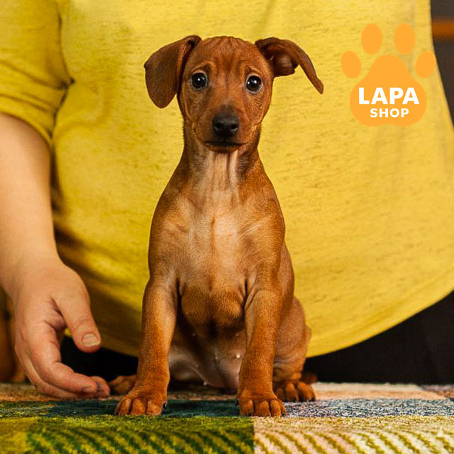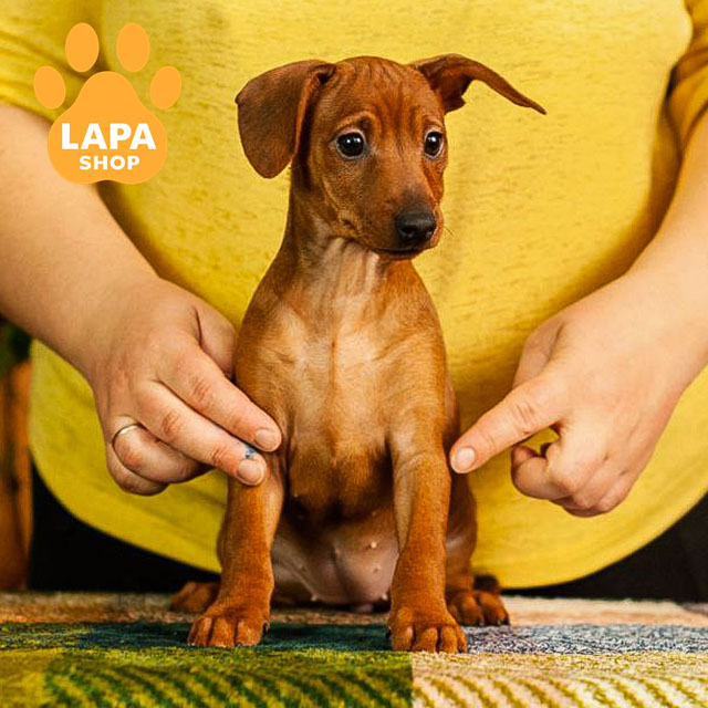 A bright red miniature pinscher girl with a distinctive, rich color that emphasizes her elegant physique and breed traits. A compact body, proportional legs, and confident posture form a harmonious silhouette.