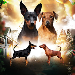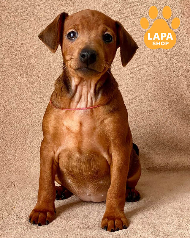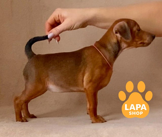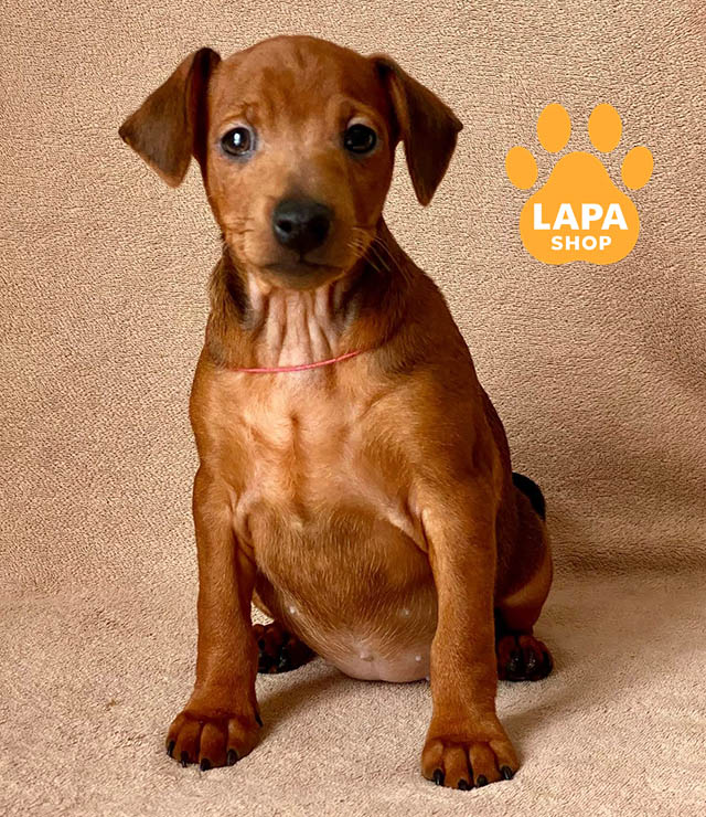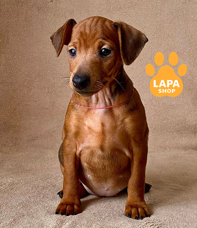 A red-haired miniature pinscher girl with harmonious body proportions and elegant posture. Her shiny coat and expressive appearance make her especially attractive. She attracts attention with her energy and grace.