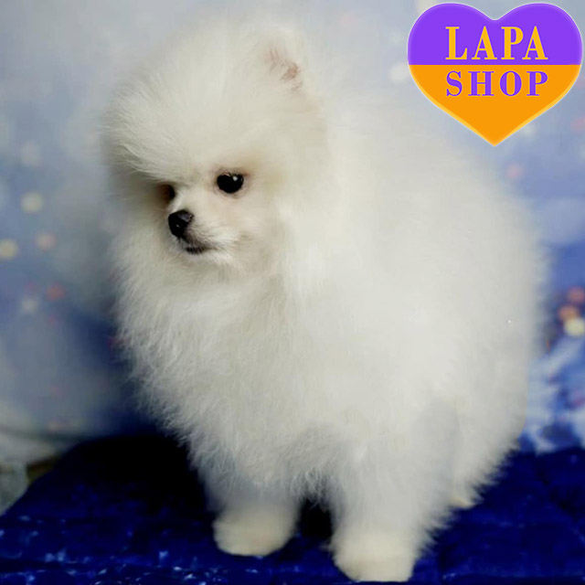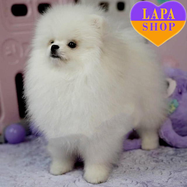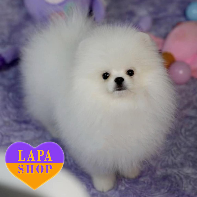 A luxurious white fluffy Pomeranian with a charming face and expressive eyes. His thick fur resembles a delicate cloud, and his compact body adds a special charm. Perfect proportions, small ears, and graceful movements make him a true creation of nature.