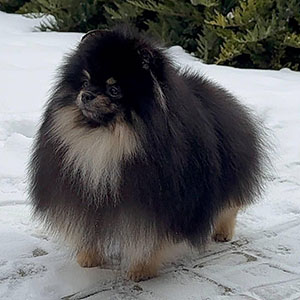 This wonderful Pomeranian has a spectacular orange-sable color, which gives it a special expressiveness. His fluffy coat and graceful appearance make him a real little aristocrat. The compact physique and expressive face add a special charm.