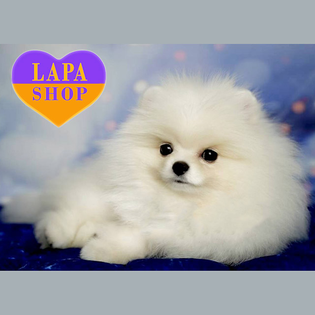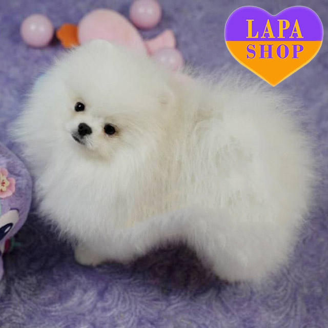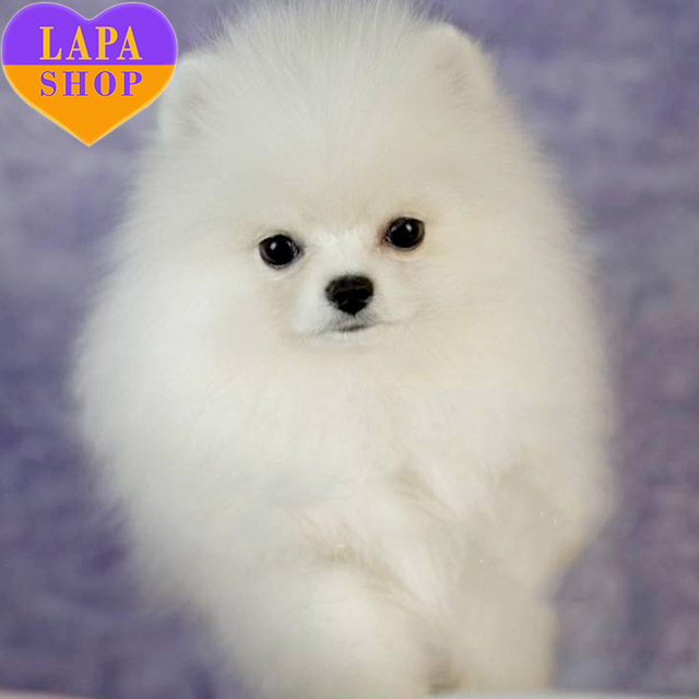 A luxurious white fluffy Pomeranian with a charming face and expressive eyes. His thick fur resembles a delicate cloud, and his compact body adds a special charm. Perfect proportions, small ears, and graceful movements make him a true creation of nature.