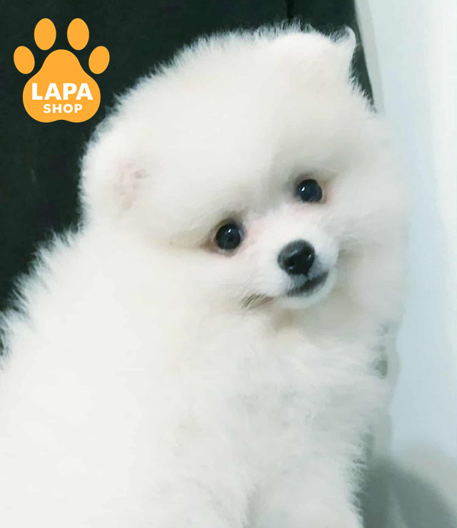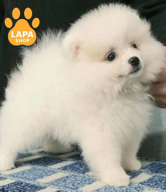 A cute girl of the Pomeranian breed, white in color. Her fluffy coat and neat face shape make her extremely attractive.
