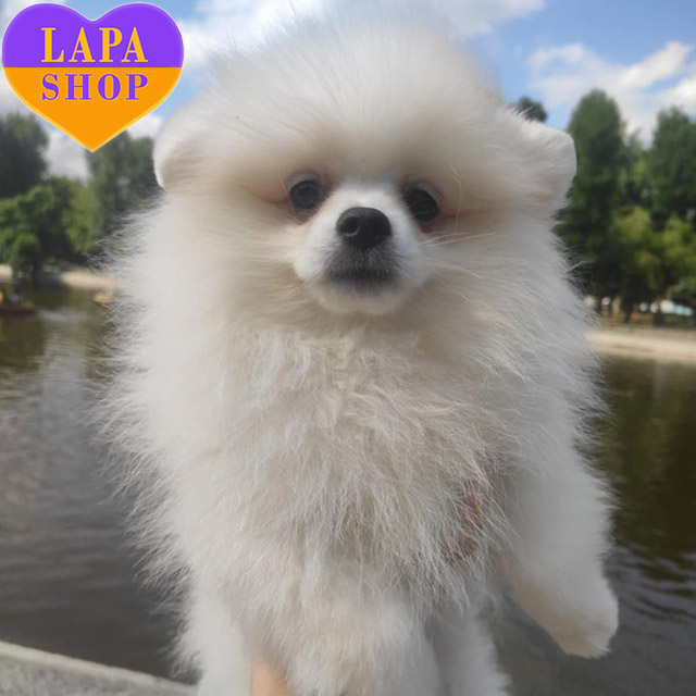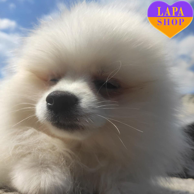 A charming white Pomeranian boy with soft and fluffy fur. Compact and harmonious, it is ideal for a loving family.