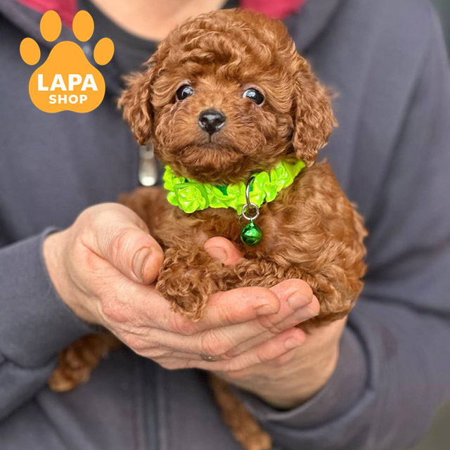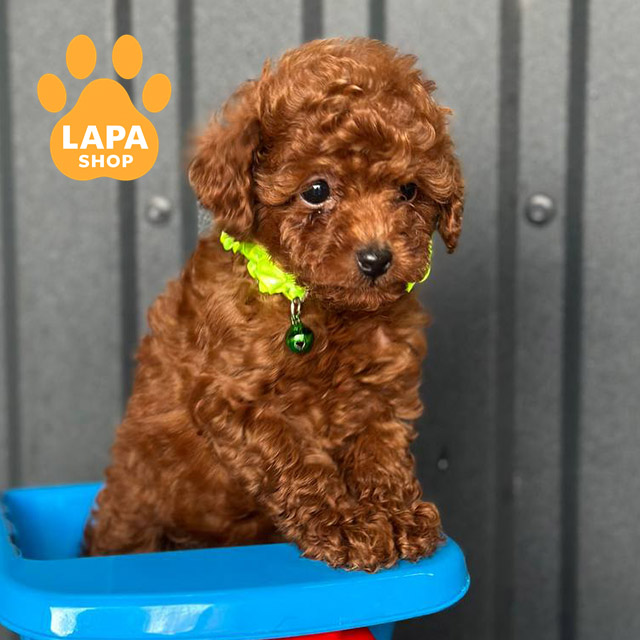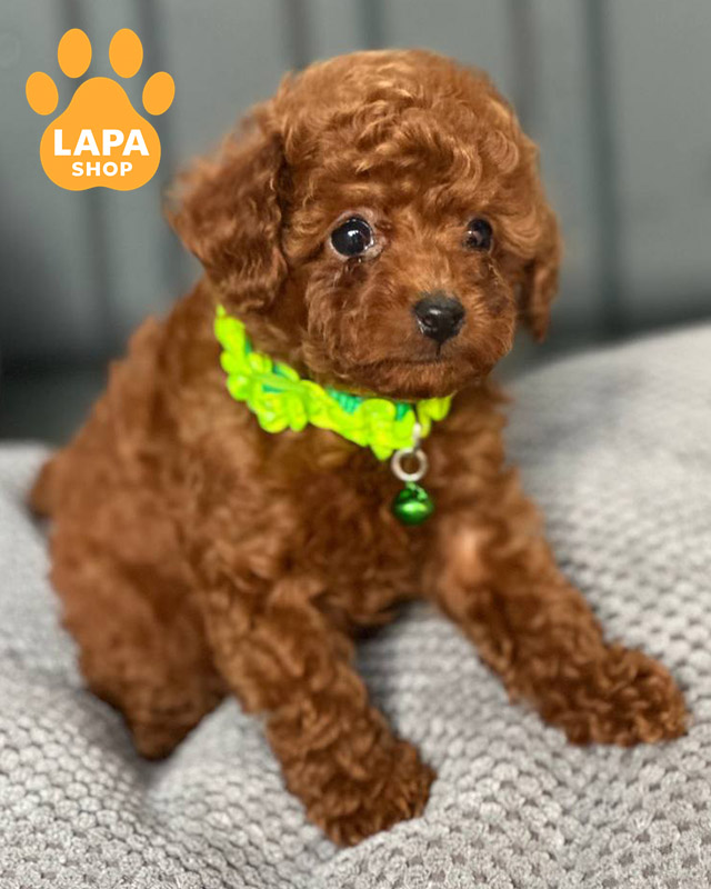 This red-haired girl of the poodle breed attracts attention with her bright coat and well-groomed appearance. It has harmonious proportions and an elegant appearance, making it attractive to a family that appreciates beauty and grace. Its coloring gives it a special charm and warmth.