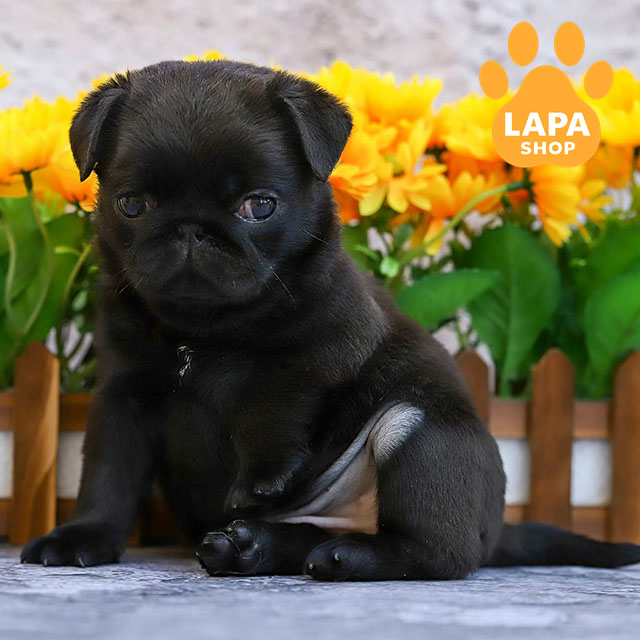 A charming girl pug in a deep black color that emphasizes her elegance and expressive features of her face. Her compact build and well-groomed coat make her extremely attractive.
