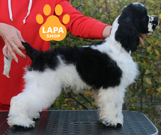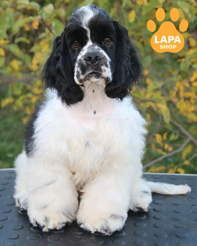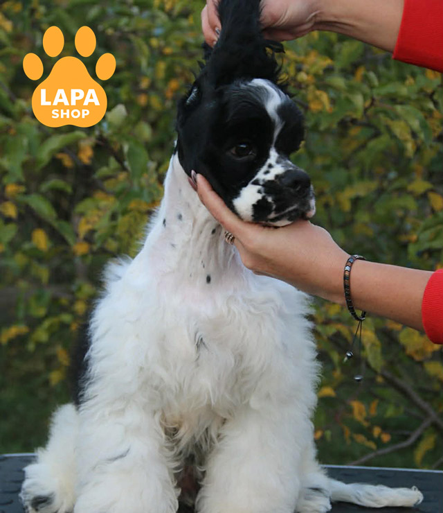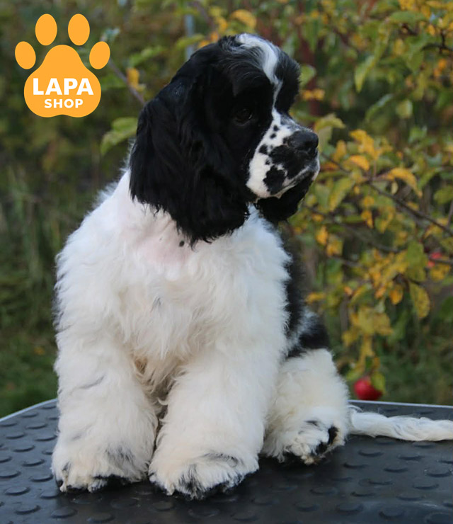 This American Cocker Spaniel boy impresses with his harmonious black and white coloring, which beautifully emphasizes his expressive face and silky coat. His appearance combines elegance and natural charm, making the baby very photogenic. Neat ears and contrasting labels add special appeal.