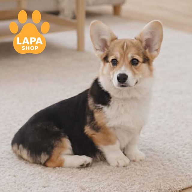 A sweet and graceful Welsh Corgi Pembroke girl with a unique natural bobtail and expressive tricolor coloring. Her compact and proportionate physique emphasizes her breed traits and makes her incredibly attractive.