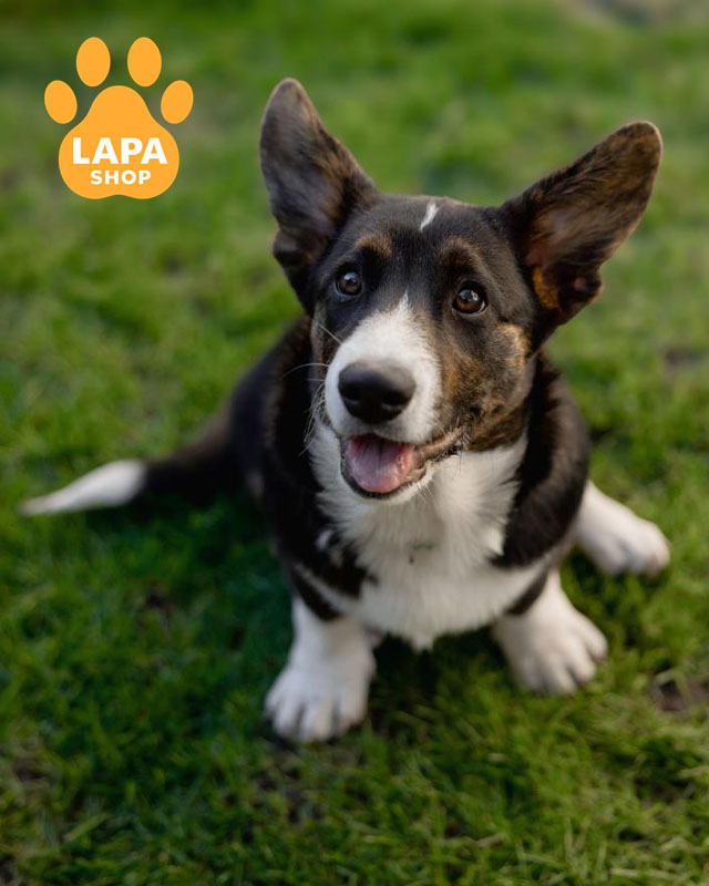 A charming girl of the Cardigan Welsh Corgi breed with a bright tricolor color. She has a harmoniously proportioned body and a cute face, which emphasizes her breed beauty. Her coat is shiny and well-groomed, adding a special charm to her appearance.
