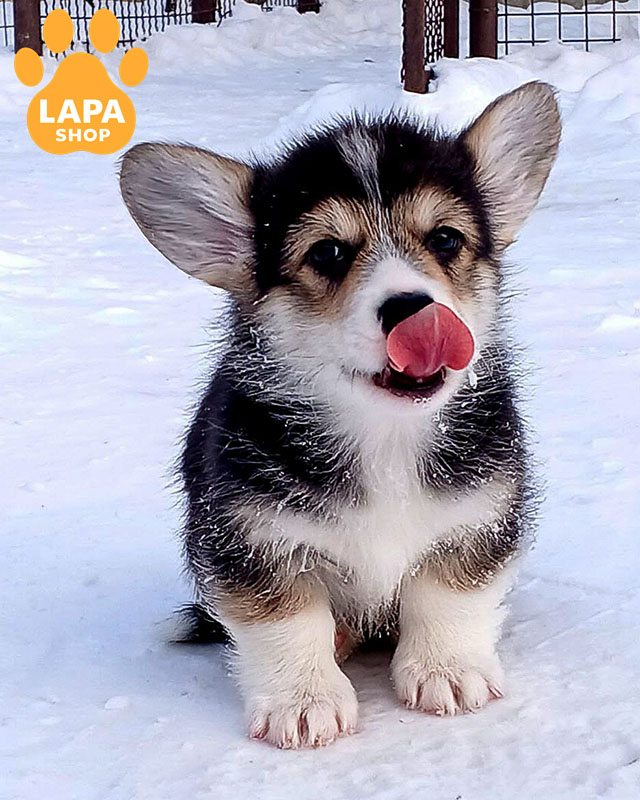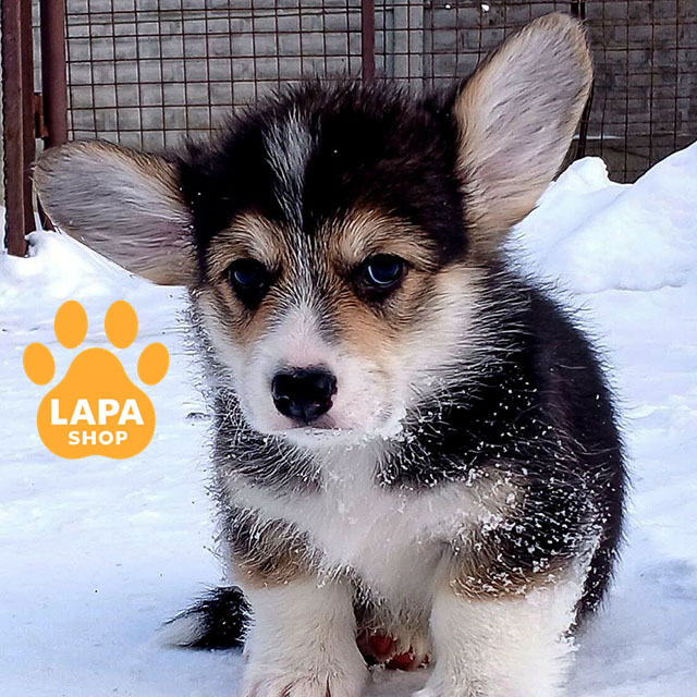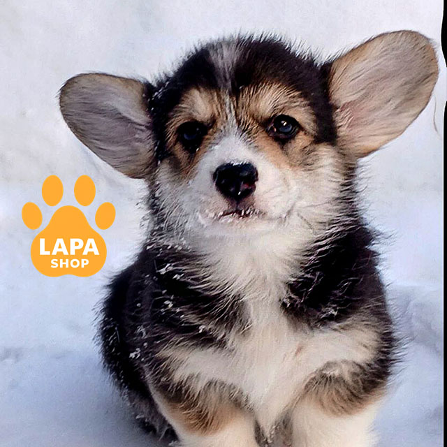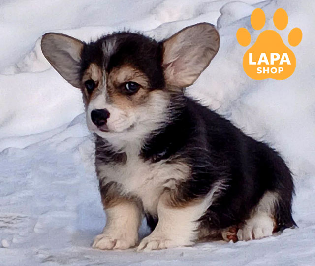 A Welsh Corgi Pembroke girl with a harmonious tricolor color and an elegant physique. Her thick and shiny coat emphasizes her pedigree and attractive appearance.