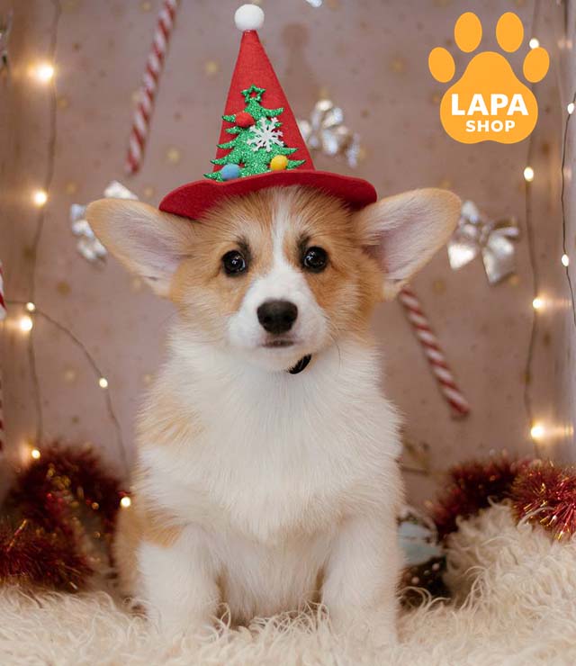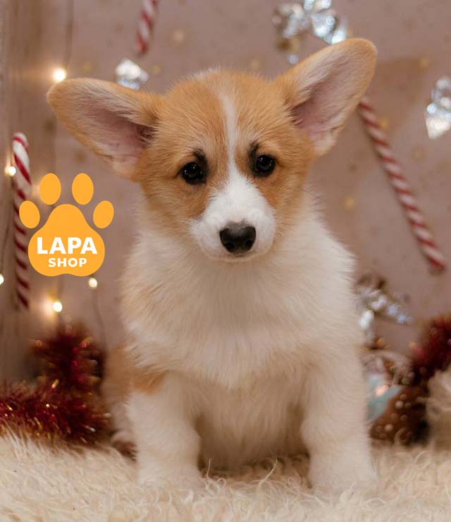 This bright tailless girl is a Pembroke Welsh Corgi with a red color with white markings, completely standard for the breed. She has a harmonious physique and well-groomed coat, which emphasizes her breed type.