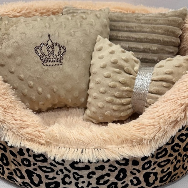 The lounger was made of furniture fabric and soft white grass fur, which gives it an elegant look and provides comfort during your rest. The moisture-resistant bottom ensures a long service life. The logo with glitter and rhinestones adds charm and special style.