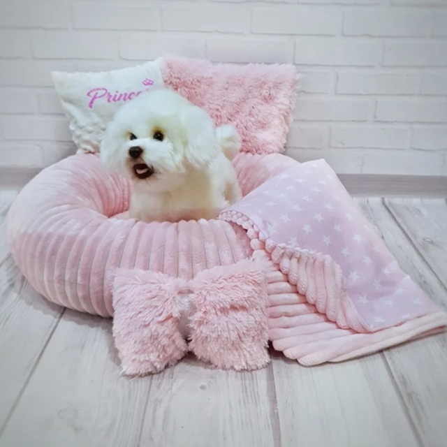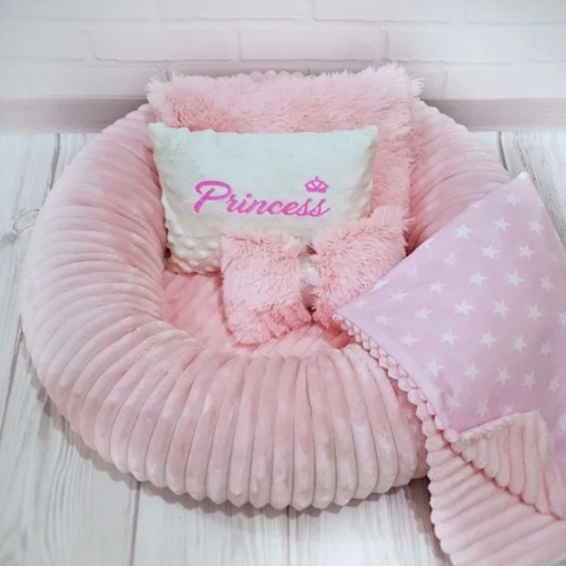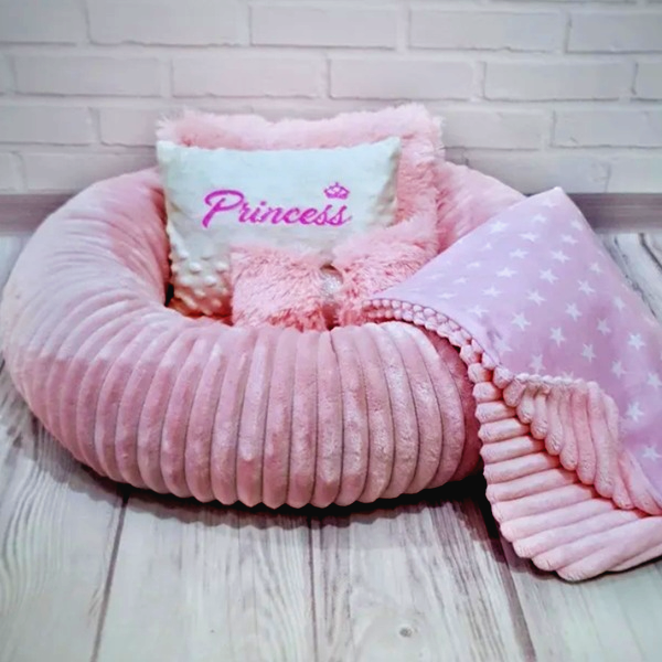 The gray dog and cat bed is the perfect place for your pet. This round bed with sides will provide your pet with coziness and comfort. Mid-size makes it ideal for animals up to 8 kg. The quality of the plush fabric and the moisture-resistant bottom guarantee durability. The set includes 2 decorative pillows, a toy and a fluffy knitted plush blanket.