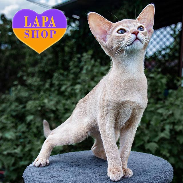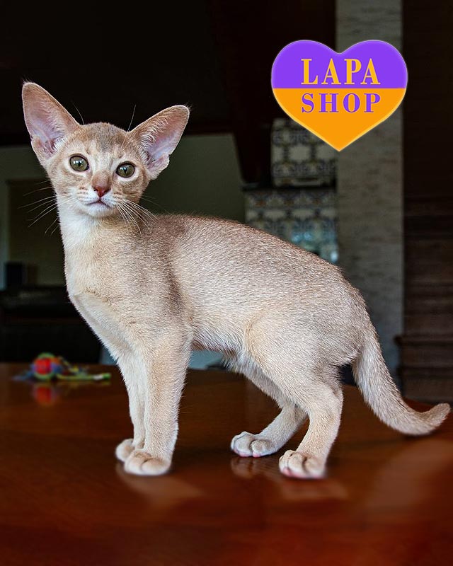 Cassiopeia — изысканная абиссинская девочка с окрасом фавн, придающим ее шерсти теплый персиково-розовый оттенок.