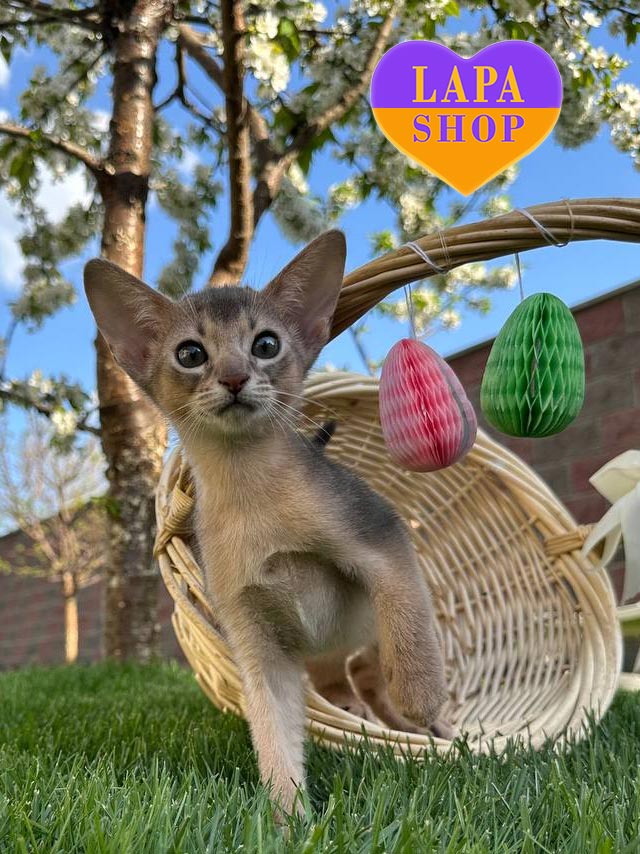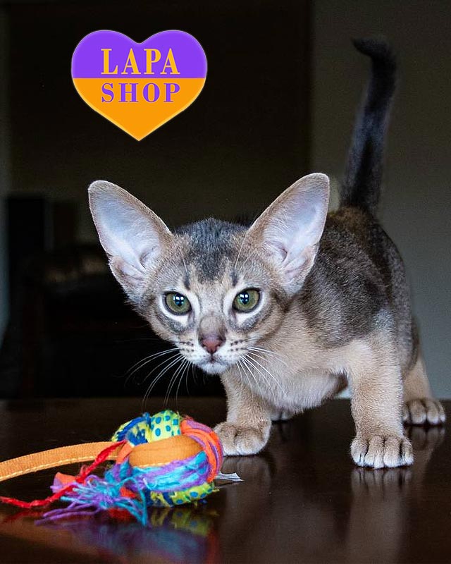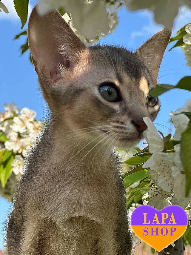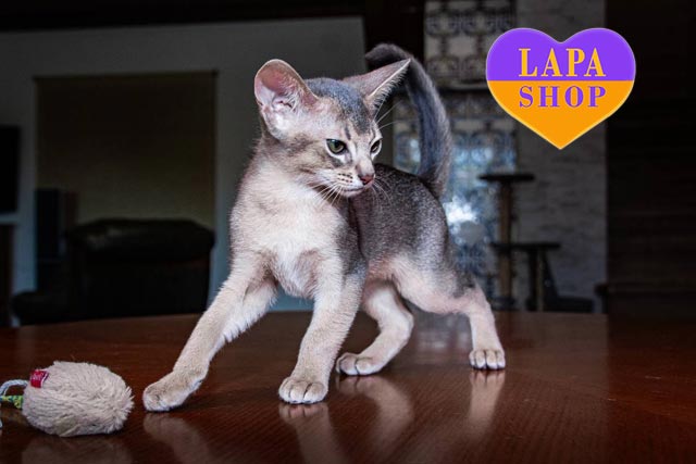 Coconut (Кокос) – изящный представитель абиссинской породы. Его голубой окрас придает образу элегантности, а грациозное тело, большие глаза и блестящая шерсть подчеркивают породный тип.