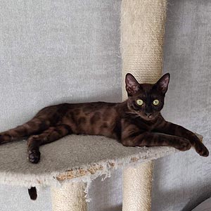 Adelia — изысканная девочка бенгальской породы в редком окрасе угольная сепия (nt 24 32), который придает ее шубке глубокий контраст и дикую красоту.