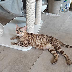 Betsy – загадочная бенгальская кошечка с редкимминк (n 24 32) окрасом, придающий ее шерсти нежного оттенка. Как носитель угольного окраса, она имеет особую глубину окраса, что делает ее еще более уникальным.