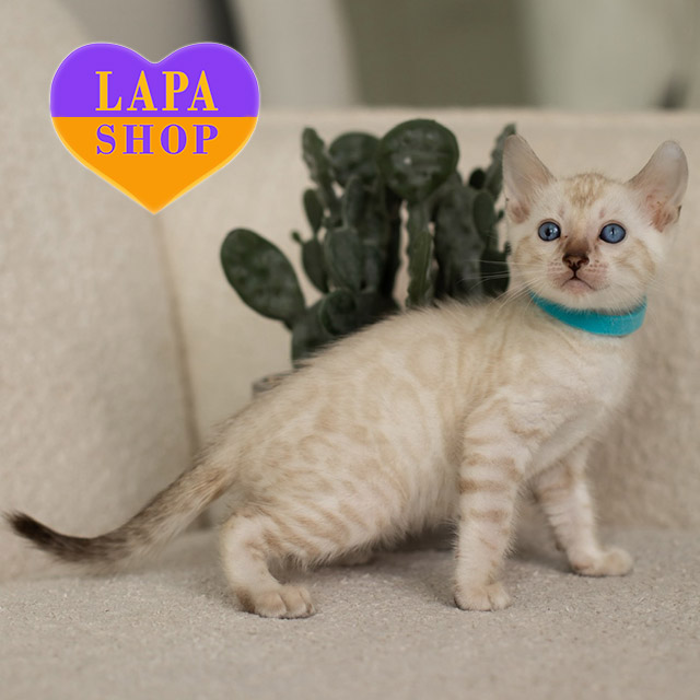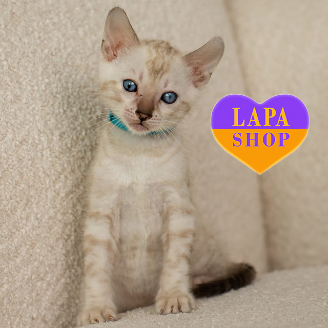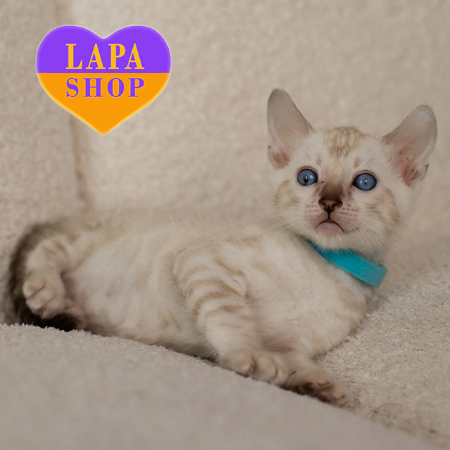 Этот красавец имеет изящный снежный (сил линк пойнт (n 33)) окрас с легким контрастом между светлым телом и более темными метками на мордашке, лапках и хвосте. Его глаза имеют светлое сияние, что придает образу загадочности и шарма. Мягенькая шерсть с характерным бенгальским блеском выглядит особенно эффектно при дневном свете.