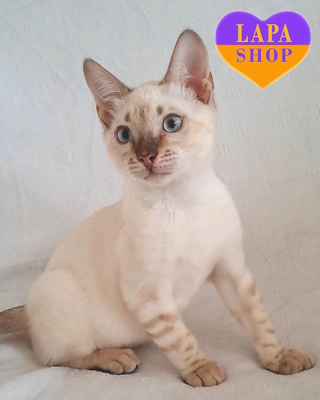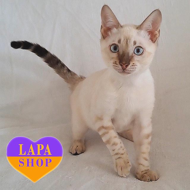 Romeo – элегантный бенгальский мальчик с редким снежным окрасом: нежная молочная шубка украшена контрастными пятнами-розетками, а взгляд голубых глаз просто завораживает.