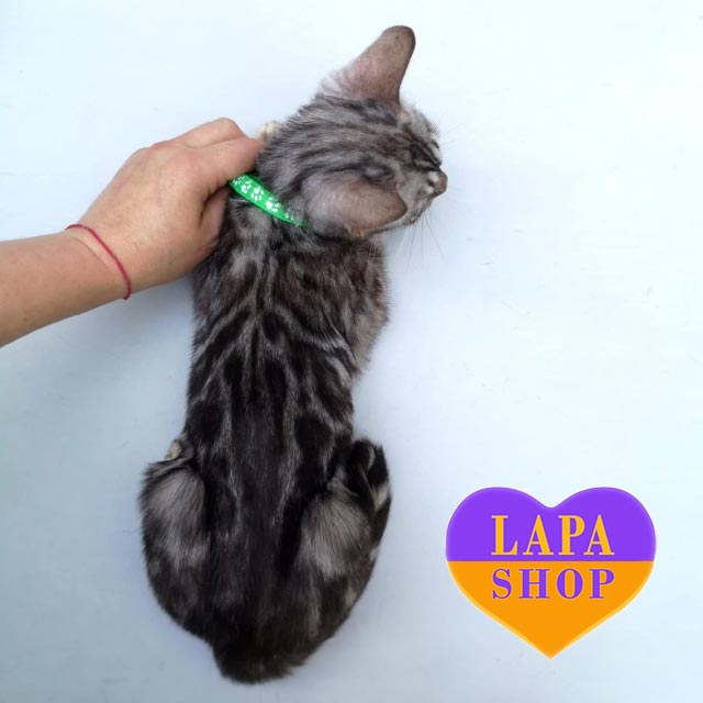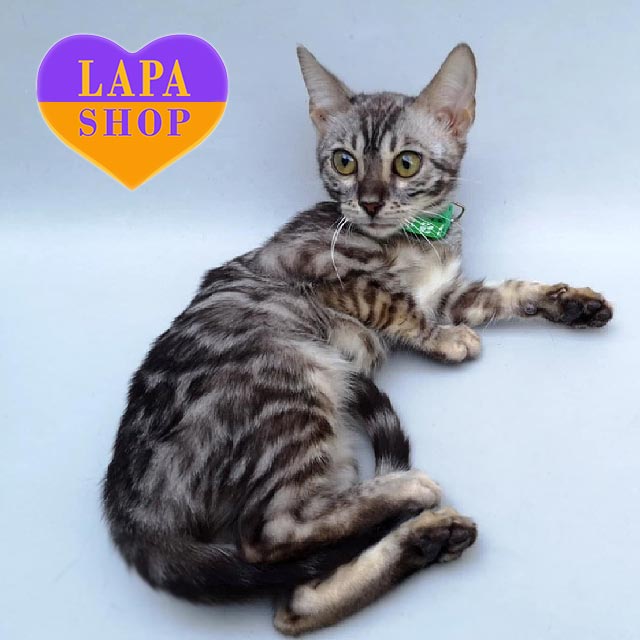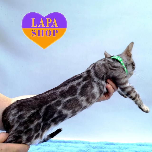 Simba — бенгальский котенок серебристого угольного окраса (ns 24 charcoal). Его шерсть имеет контрастный рисунок с темными угольными розетками или пятнами на холодном серебристом фоне, что создает эффект утонченной дикой красоты.